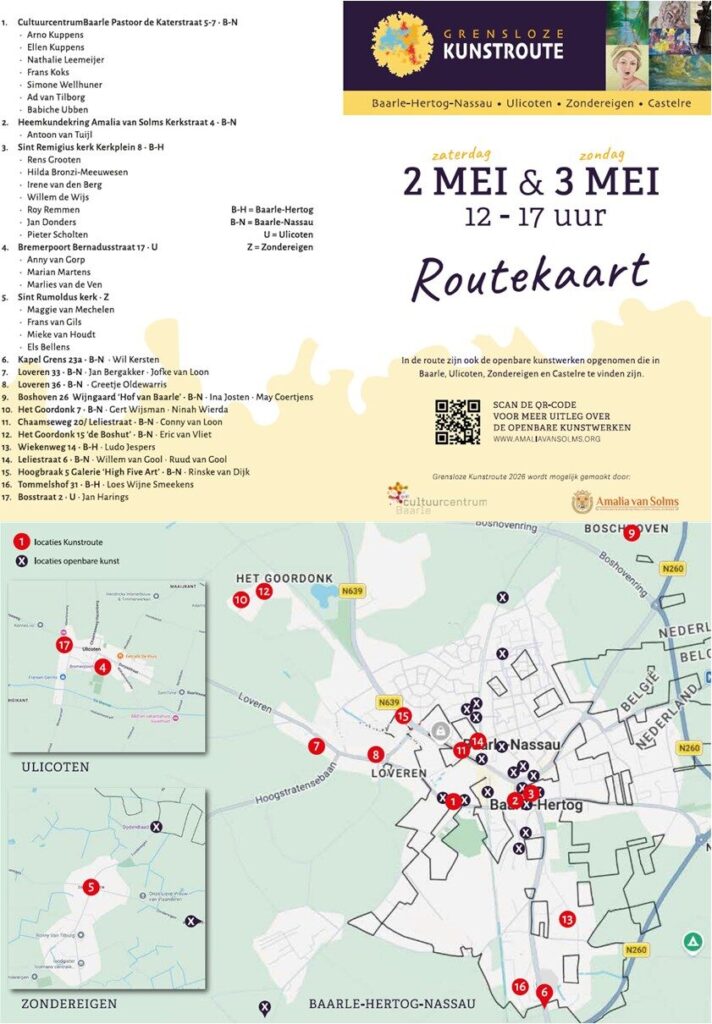 Het Cultuurcentrum Baarle organiseert, in samenwerking met de Heemkundering Amalia van Solms en Visit Baarle, in het weekend van zaterdag 2- en zondag 3 mei 2026 de eerste Grensloze Kunstroute. Deze kunstroute verbindt de vier kernen van onze enclavegemeente: Baarle-Hertog / Baarle-Nassau, Ulicoten, Zondereigen en Castelré.