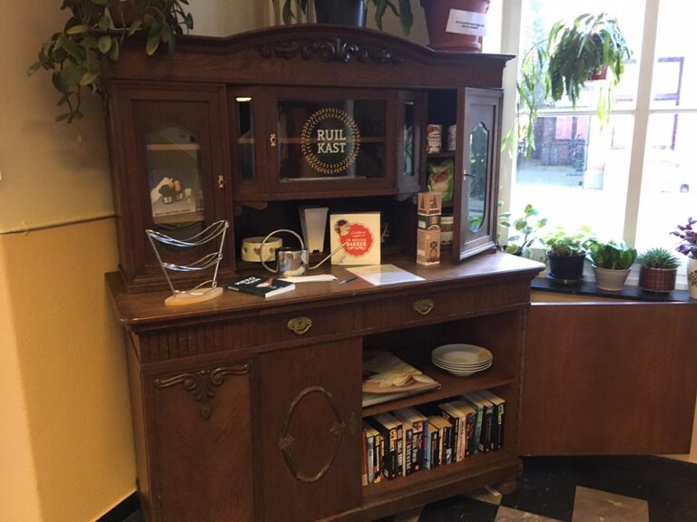 In de ruilkast kan je alle spullen die in goede staat en schoon zijn, aanbieden. Alle spullen zijn welkom, zolang ze in de kast passen. We plaatsen geen spullen voor, naast of op de kast. Voedingsmiddelen zijn ook toegestaan, in zoverre ze niet over datum zijn of de blikjes geopend. Zie je iets moois in de kast, maar heb je zelf niet niks bij? Alleen iets meenemen mag ook. In de kast liggen kaartjes waarop je een boodschap kan achterlaten voor de nieuwe eigenaar.